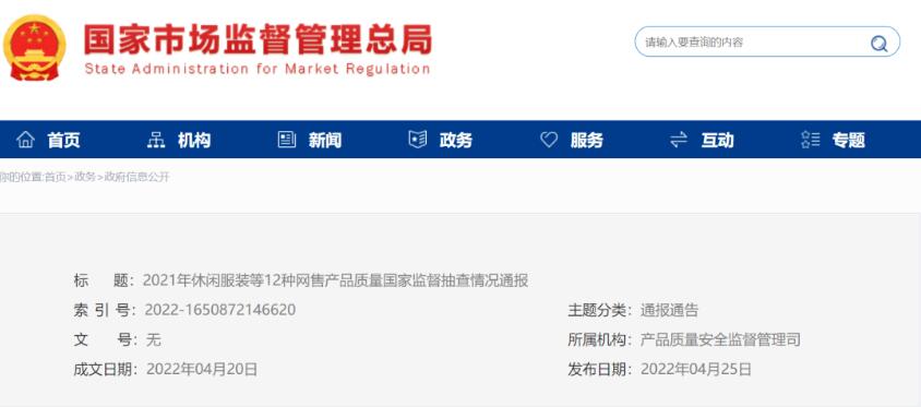 2022年4月,國家市場監(jiān)督管理總局發(fā)布了《2021年休閑服裝等12種網(wǎng)售產(chǎn)品質(zhì)量國家監(jiān)督抽查情況通報》。該通報顯示,深圳市安若依電子商務(wù)有限公司生產(chǎn)的休閑服裝存在可分解致癌芳香胺染料、耐水色牢度、耐堿汗?jié)n色牢度等三個不合格項目。