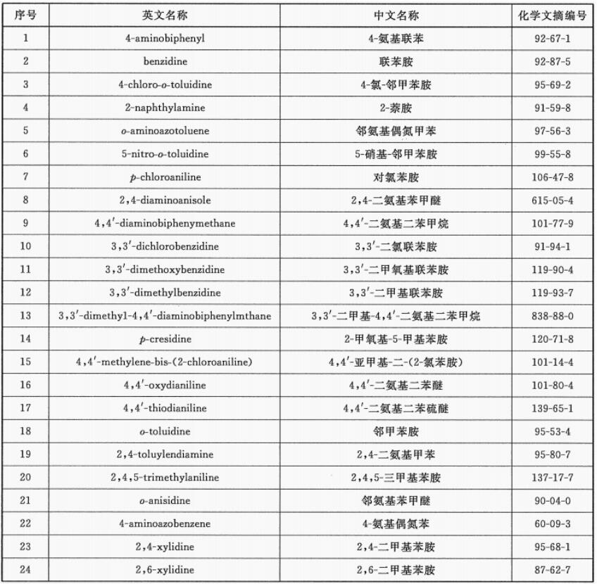國家紡織品強(qiáng)制性標(biāo)準(zhǔn) GB 18401-2010 《國家紡織產(chǎn)品基本安全技術(shù)規(guī)范》中,要求禁用能夠分解出如下24種芳香胺的染料,要求是不超過20mg/kg。